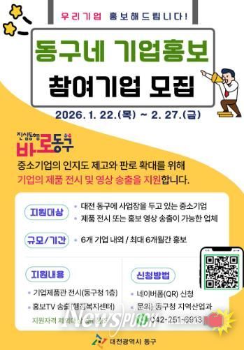 뉴스펀치 이현승 기자 | 대전 동구는 다음 달 27일까지 ‘동구네 기업홍보’ 사업에 참여할 지역 중소기업을 공개 모집한다고 23일 밝혔다.