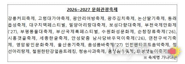 ‘2026~2027 문화관광축제’는 지난 2년간 전문가와 소비자, 지역주민 평가 결과와 바가지요금 등 부정적 문제 여부, 수용 태세 등을 종합적으로 고려해 선정했다.