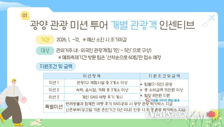 해당 사업은 1월 26일부터 운영되며, 예산 소진 시 조기 마감될 수 있고 연 1회만 지원돼 중복 참여는 불가하다. 특히 광양매화축제 기간에 방문하는 팀은 선착순 60팀으로 제한해 접수할 예정이다.
