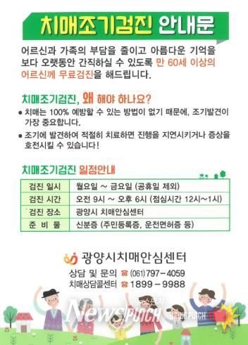 뉴스펀치 최영남 기자 | 광양시치매안심센터는 치매를 조기에 발견하고 예방하기 위해 60세 이상 시민을 대상으로 치매 조기검진을 연중 실시하고 있다.