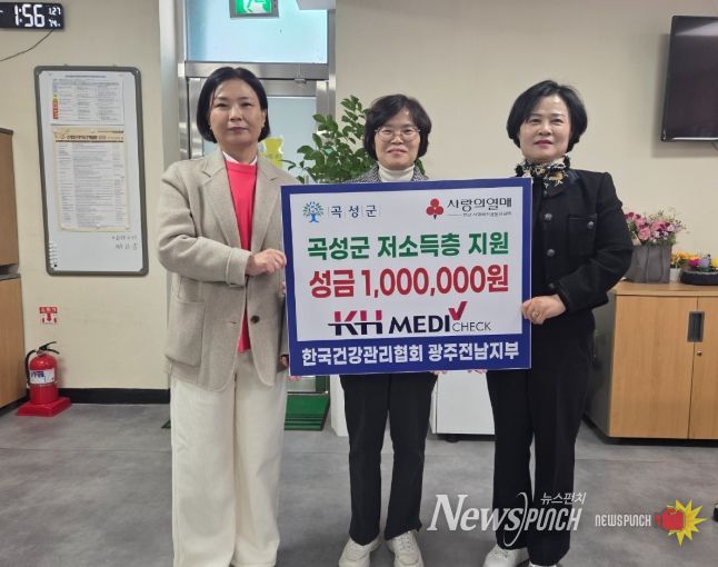 뉴스펀치 김용희 기자 | 전남 곡성군은 지난 27일 한국건강관리협회 광주전남지부(본부장 박종석)가 곡성군 지정 전남사회복지공동모금회에 1백만 원을 기부했다고 밝혔다.