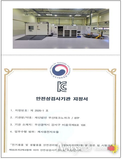 이번 자격 취득을 통해 (재)부산테크노파크는 'KC10031' 기준에 따른 사용후 배터리 안전성 검사를 공식 수행할 수 있게 됐다.