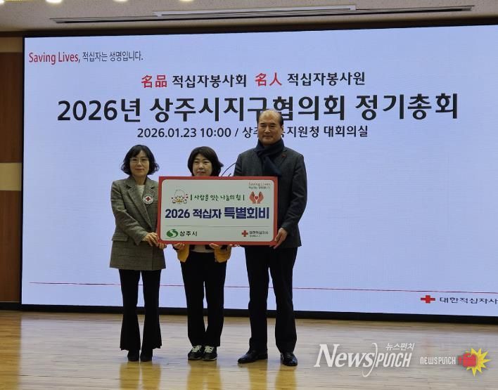 뉴스펀치 박세훈 기자 | 상주시는 지난 1월 28일 10시 상주교육지원청 대회의실에서 열린 ‘대한적십자사 봉사회 상주시지구협의회 정기총회’에 참석하여 대한적십자사 경북지사에 2026년도 적십자 특별회비를 전달했다.