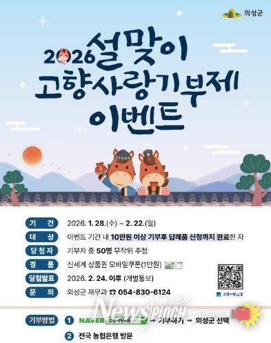 김주수 의성군수는 “설 명절을 맞아 고향을 응원하고 지역 발전에 힘을 보태주시는 분들께 감사의 마음을 전하고자 이번 이벤트를 마련했다”며 “고향사랑기부제를 통해 의성의 우수한 농특산물도 만나보고, 나눔의 의미를 함께하는 뜻깊은 명절이 되길 바란다”고 말했다.