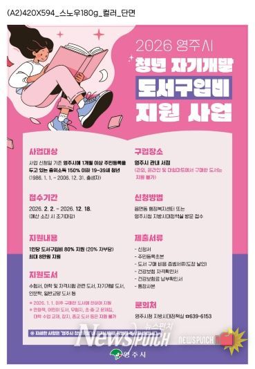뉴스펀치 박세훈 기자 | 영주시는 청년들의 학습 역량을 높이고 지역 서점 이용을 활성화하기 위해 '청년 자기개발 도서구입비 지원사업'을 추진하고, 오는 2월 2일부터 신청 접수를 시작한다.