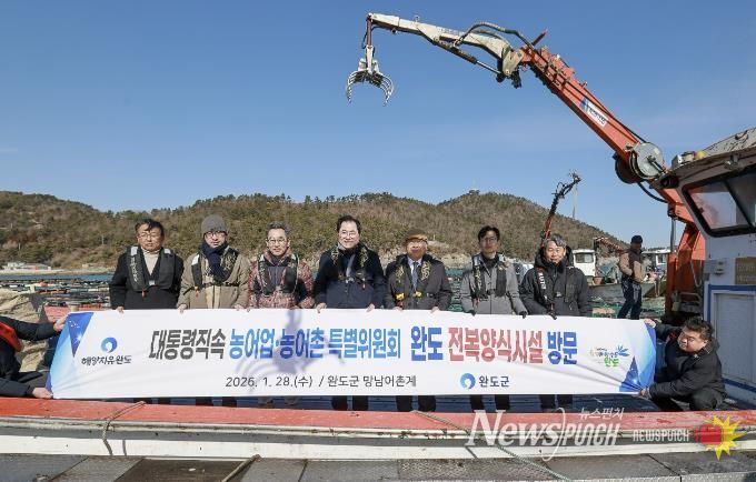 뉴스펀치 김용희 기자 | 지난 1월 28일 대통령 직속 자문기구인 ‘농어업·농어촌 특별위원회’의 김호 위원장과 문승국 위원(한국해양수산신지식인중앙연합회장) 등이 완도군의 전복 양식장을 찾았다.