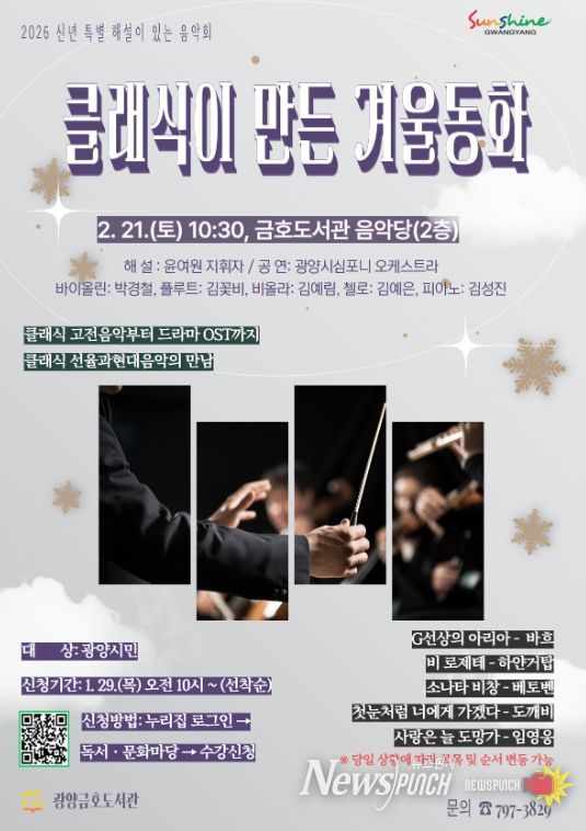 뉴스펀치 김용희 기자 | 광양금호도서관은 신년을 맞아 오는 2월 21일 오전 10시 30분, 금호도서관 음악당에서 오케스트라와 함께하는 ‘해설이 있는 음악회’ '클래식이 만든 겨울동화'를 개최한다.