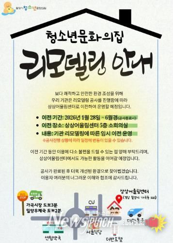 손순미 여성가족과장은 “이번 리모델링은 청소년들의 성장과 참여를 지원하는 공간으로 만들기 위한 필수적인 과정이며 공사 기간에도 프로그램 이용에 차질이 없도록 최선을 다할 것”이라며, “더 멋진 모습으로 재탄생할 청소년문화의집을 기대해 달라”고 전했다.