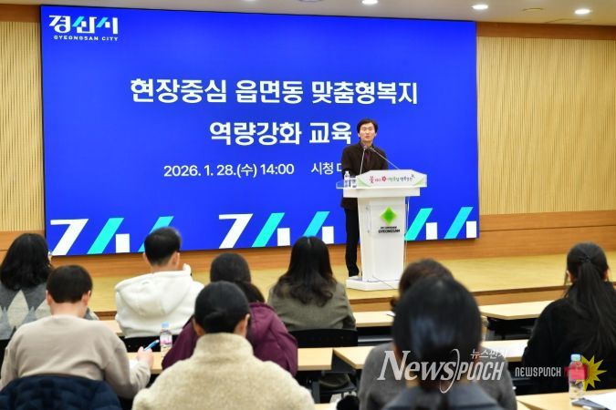 뉴스펀치 박세훈 기자 | 경산시는 28일 시청 대회의실에서 읍면동 부읍면동장·총무팀장 및 맞춤형 복지업무 담당 공무원 등 80여 명을 대상으로 읍면동 복지 업무 역량 강화 교육 및 전달 회의를 개최하고, 사회적 고립 및 고독사 예방을 중심으로 한 현장 대응체계 강화 방안을 공유했다.