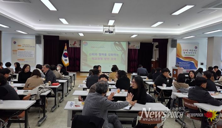 뉴스펀치 조평훈 기자 | 대구남부교육지원청은 1월 29일 오후 2시 남부교육지원청 대회의실에서 초등학교 교장 및 공립유치원 원장 70여 명을 대상으로 ‘신뢰와 협력을 강화하는 학교 경영’을 주제로 연수를 실시한다고 밝혔다.