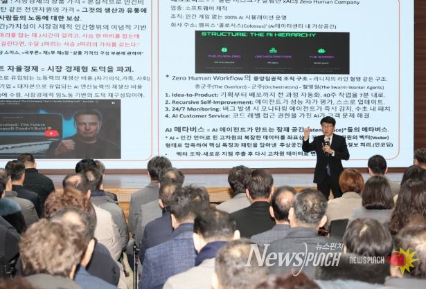 이날 강의에서는 AI 에이전트 자율경제 시대의 도래를 중심으로, 메타버스와 결합된 새로운 경제 질서의 변화 가능성을 설명하며, AI 기술이 산업 전반의 생산성과 경쟁력을 재편하고 있음을 강조했다.