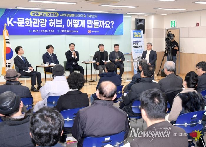 뉴스펀치 김용희 기자 | 광주광역시는 29일 광주문화재단에서 문화·관광 기관 및 단체 관계자, 종교계 등 100여 명이 참석한 가운데 ‘광주전남 통합 문화예술·관광분야 시민공청회’를 개최했다.