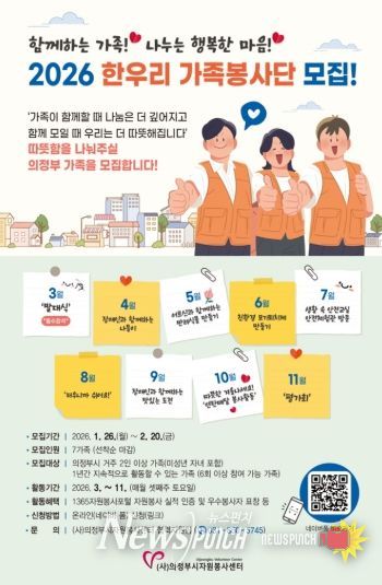 뉴스펀치 박상훈 기자 | 의정부시자원봉사센터는 지난 1월 26일부터 의정부시 가족 단위 자원봉사 활성화를 위해 2026년 신규 ‘한우리 가족봉사단’ 모집을 시작했다.