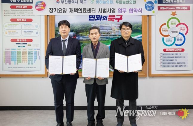 뉴스펀치 김윤걸 기자 | 부산 북구는 29일 지역 내 의료·돌봄 연계를 강화하기 위해 장기요양 재택의료센터 빛하늘의원(금곡동), 푸른솔한의원(덕천동)과 업무협약을 체결했다고 밝혔다.