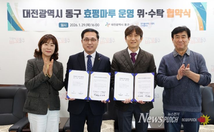 뉴스펀치 이현승 기자 | 대전 동구는 29일 한국폴리텍Ⅳ대학 산학협력단(단장 김건완)과 효평마루 민간위탁 운영을 위한 위·수탁 협약을 체결했다고 밝혔다.