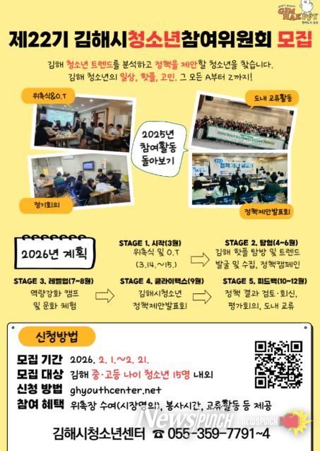 모집 대상은 김해시에 거주하거나 관내 학교에 재학 중인 중·고등 연령의 청소년이며, 신청 기간은 2월 1일부터 2월 21일까지다.