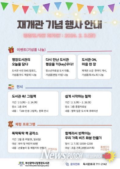 부산광역시립명장도서관(관장 조수금)은 재개관을 기념해 2월 한 달간 시민과 함께하는 전시·체험·이벤트 프로그램을 운영한다.
