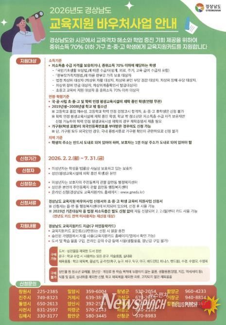 뉴스펀치 박세훈 기자 | 사천시는 경남도 내 거주하는 중위소득 70% 이하 가구의 초·중·고 학생을 대상으로 학력 향상과 균등한 교육기회 제공을 위해 ‘2026년 경상남도 교육지원 바우처사업’을 시행한다고 밝혔다.