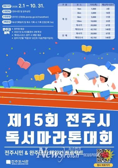 한편 제15회 전주시 독서마라톤 대회는 오는 2월 1일부터 전주도서관 누리집을 통해 신청할 수 있으며, 기타 자세한 사항은 전화로 문의하면 된다.