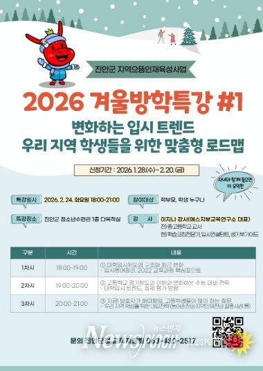 뉴스펀치 정홍균 기자 | 진안군은 겨울방학을 맞아 관내 학생들과 학부모들의 입시 불안감을 해소하고 체계적인 진로 설계를 지원하기 위해 ‘2026 겨울방학 입시특강 및 1:1 맞춤형 컨설팅’을 개최한다.