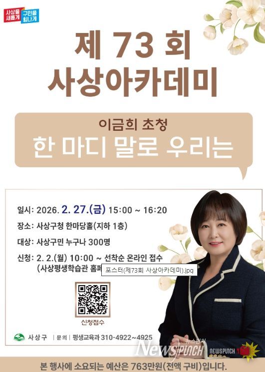 뉴스펀치 김윤걸 기자 | 부산 사상구는 오는 2월 27일 오후 3시, 사상구청 한마당홀에서 이금희 아나운서를 초청하여 ‘제73회 사상아카데미’를 개최한다.