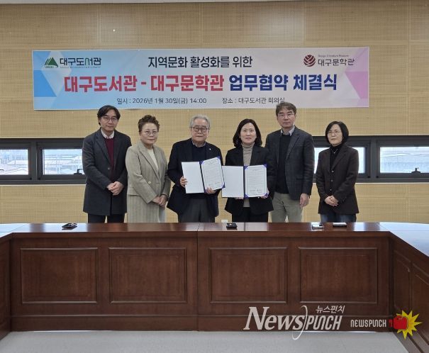 뉴스펀치 조평훈 기자 | 대구도서관과 대구문학관은 시민을 위한 독서문화 분야 협력을 강화하고 상호 발전을 도모하기 위해 1월 30일 오후 2시, 대구도서관 회의실에서 업무협약을 체결했다.