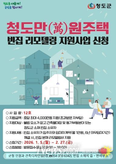 뉴스펀치 박세훈 기자 | 청도군은 빈집 활용을 통한 주거 안정과 정주 여건 개선을 위해 2026년도 '청도만(萬)원주택사업'빈집 사업자에 대한 추가모집을 실시한다고 밝혔다.