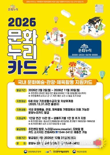 뉴스펀치 김용희 기자 | 장흥군은 2월 2일부터 6세 이상 기초수급자 및 차상위계층을 대상으로 2026년 통합문화이용권(문화누리카드) 사업을 실시한다고 밝혔다.