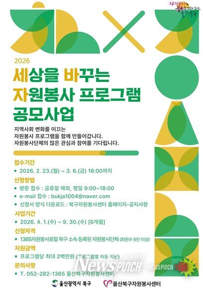 뉴스펀치 김윤걸 기자 | (사)울산북구자원봉사센터는 지역사회 문제 해결을 위한 자원봉사단체의 자율적이고 창의적인 활동을 지원하고자, ‘2026 세상을 바꾸는 자원봉사 프로그램 공모사업’을 추진한다.
