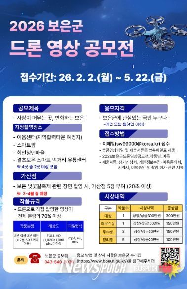 뉴스펀치 이현승 기자 | 충북 보은군은 드론 영상을 통해 지역의 변화와 매력을 전국에 알리기 위해 ‘2026 보은군 드론 영상 공모전’을 개최하고, 오는 2월 2일부터 작품 접수를 시작한다.