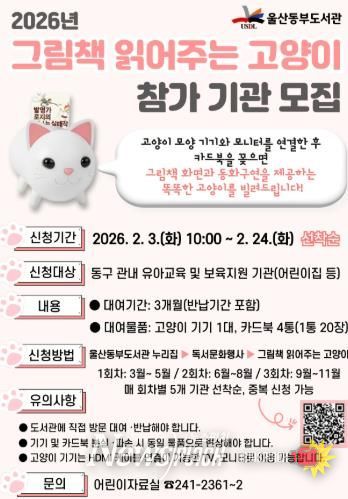 뉴스펀치 김윤걸 기자 | 울산동부도서관은 2월 3일부터 24일까지 동구 어린이집과 유치원, 보육 기관 등을 대상으로 ‘그림책 읽어주는 고양이’ 프로그램 참가 기관을 모집한다.