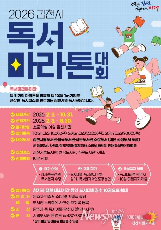 뉴스펀치 박세훈 기자 | 김천시립도서관에서는 시민의 독서문화 증진과 도서관 이용 생활화 유도를 위해 2월 3일부터 10월 31일까지 9개월간의 여정으로 '독서마라톤 대회'와 '도서관 스탬프 투어'를 개최한다.