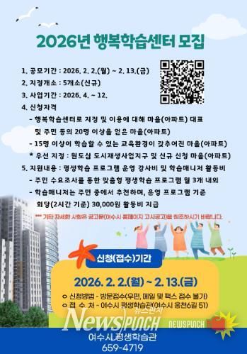 뉴스펀치 김용희 기자 | 여수시는 주민 생활권 중심의 평생학습 기회를 확대하기 위해 '2026년 읍·면·동 행복학습센터' 신규 지정 사업에 참여할 마을(아파트)을 모집한다고 밝혔다.