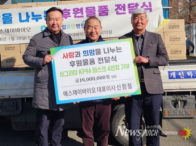뉴스펀치 정홍균 기자 | ㈜에스제이바이오는 1월 28일 무주군립요양병원에 ‘싱그라미 마스크’ 4만 장(1천4백만 원 상당)을 기부하며 훈훈함을 전했다.