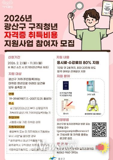 광산구는 2월부터 고물가와 취업난이란 이중고 상황에서 청년의 취업 역량 강화와 구직 활동에 드는 경제적 부담 완화를 돕는 ‘2026년 구직 청년 자격증 취득비용 지원사업’을 추진한다고 2일 밝혔다.