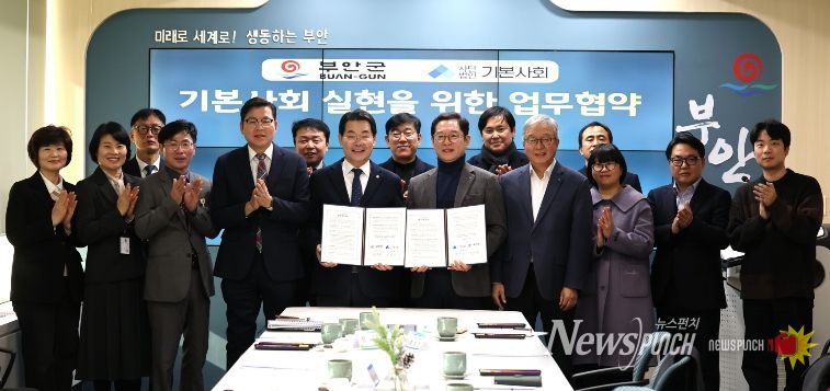뉴스펀치 정홍균 기자 | 부안군은 2일 군청 중회의실에서 사단법인 기본사회와 ‘기본사회 실현을 위한 업무협약(MOU)’을 체결하고, 지역 실정에 맞는 기본사회 정책 발굴과 실행을 위한 전략적 협력체계를 구축했다.
