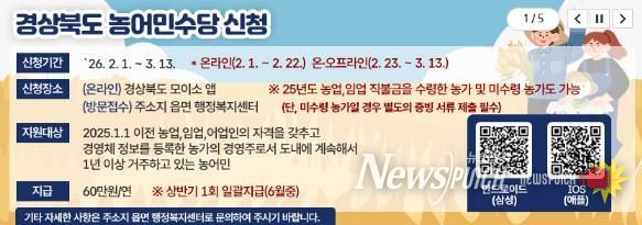 경상북도 농어민수당은 농가당 연 60만 원이 지급되며, 자격 요건 검증과 심의 절차를 거쳐 상반기 중 지역사랑상품권 또는 지역사랑선불카드 형태로 지급될 예정이다.