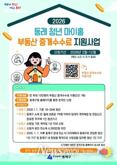 뉴스펀치 김윤걸 기자 | 부산 동래구는 청년의 주거 안정을 지원하고 청년 창업을 유도하기 위해 ‘2026년 동래 청년 마이홈 부동산 중개수수료 지원 사업’을 추진한다고 밝혔다. 접수 기간은 12월 10일까지이며, 예산 소진 시 조기 마감된다.
