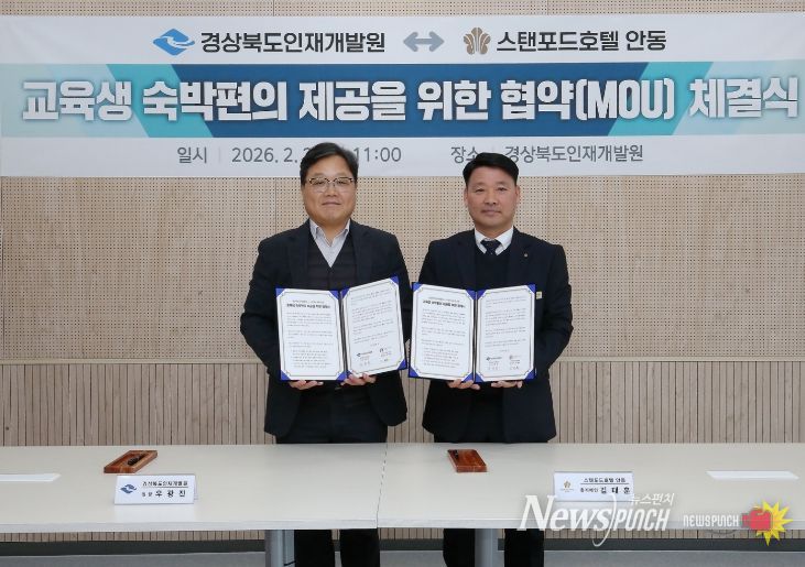 뉴스펀치 박세훈 기자 | 경상북도인재개발원은 2.2. 인재개발원에서 ‘스텐포드호텔 안동’과 교육생 숙박 편의 제공 및 지역 관광 활성화를 위한 업무협약(MOU)을 체결했다.
