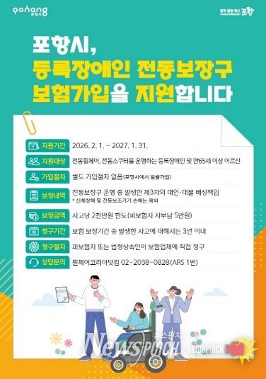 뉴스펀치 박세훈 기자 | 포항시는 장애인의 안전한 이동권 보장하고 사고 발생 시 경제적 부담을 덜어주기 위해 추진 중인 ‘장애인 전동보장구 배상책임보험 지원사업’을 2월부터 갱신 시행한다.
