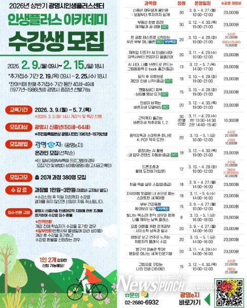 뉴스펀치 박상훈 기자 | 광명시 인생플러스센터는 신중년의 인생 2막 탐색과 준비를 지원하는 ‘2026년 상반기 인생플러스 아카데미’ 수강생 380명을 오는 9일부터 선착순 모집한다.