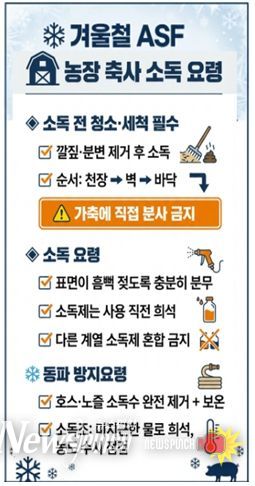 설 명절 전후 운영 중인 '일제 소독주간(~2.8.)'과 연계해 사료 운반 차량, 분뇨 수거 차량, 축산 기자재 등 교차 오염 우려 대상에 대한 소독도 강도 높게 시행된다. 도내 축산농가 진입로와 주변 도로에 대한 광역 소독도 병행해 빈틈없는 방역망을 구축한다.