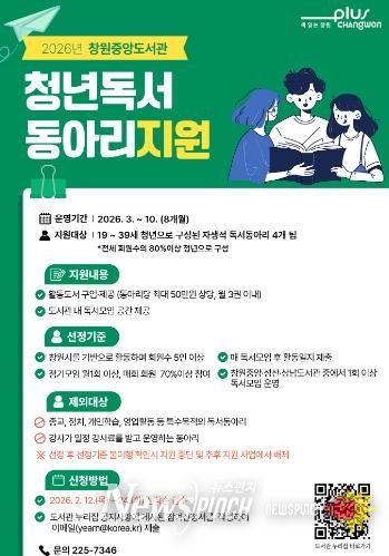 뉴스펀치 박세훈 기자 | 창원특례시 창원중앙도서관은 건강한 청년 문화 조성을 위해 청년의 자율적인 독서모임을 지원하는 ‘청년독서동아리 지원’ 사업에 참여할 독서모임을 모집한다.