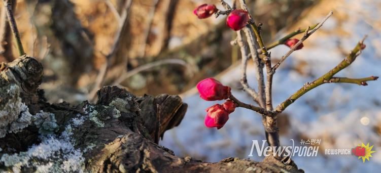 뉴스펀치 김용희 기자 | 입춘을 이틀 앞둔 2일, 밤사이 눈이 내린 가운데 광양시청 앞 미관광장 매화동산에서 홍매가 개화했다.