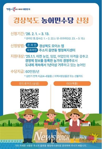 뉴스펀치 박세훈 기자 | 경상북도는 농어업과 농어촌의 공익적 가치를 유지·증진하는 농어민지원을 위해 추진하고 있는 ‘2026년 경상북도 농어민 수당’신청을 오는 2월 1일부터 접수한다.