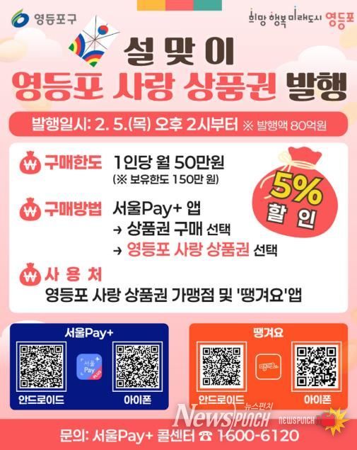뉴스펀치 박상훈 기자 | 영등포구가 새해를 맞아 위축된 소비 심리를 회복하고 지역 내 소상공인의 매출 증대를 돕기 위해 오는 2월 5일 오후 2시부터 총 80억 원 규모의 ‘영등포 사랑상품권’을 발행한다고 밝혔다.