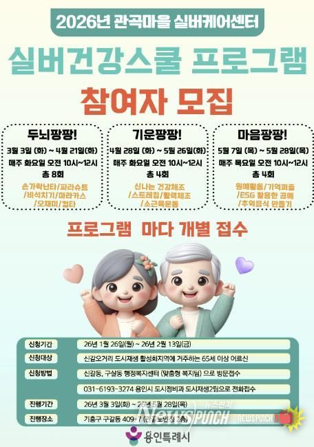 뉴스펀치 박상훈 기자 | 용인특례시는 ‘관곡마을 실버케어센터 실버건강 프로그램’ 참가자를 13일까지 모집한다.