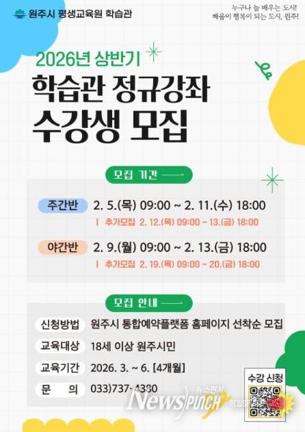 뉴스펀치 조평훈 기자 | 원주시 평생교육원 학습관은 2026년 상반기 정규강좌 주·야간반 수강생을 모집한다.