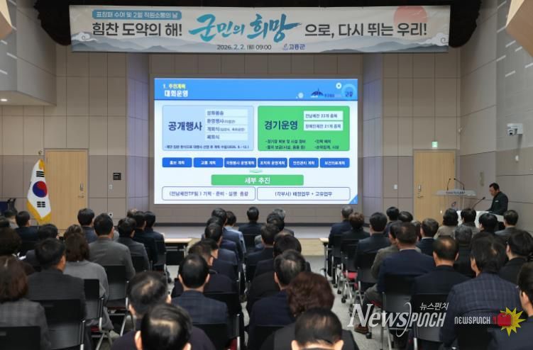 뉴스펀치 김용희 기자 | 고흥군이 2027년 전라남도체육대회 개최를 앞두고 지난 2일 군청 우주홀에서 전 직원을 대상으로 2027년 전남체전 기본 방향과 추진 전략을 공유하며 본격적인 준비에 돌입했다.