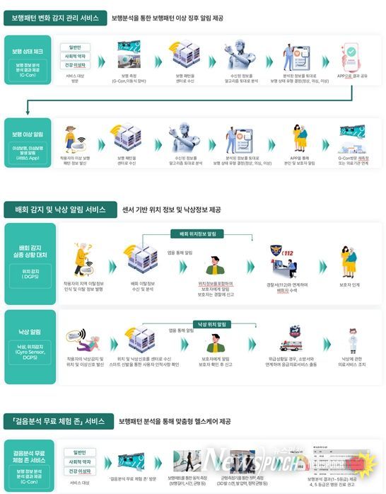 한편, '사물 인터넷(IoT)기반 스마트신발을 활용한 사회적약자 지원서비스 사업'은 65세 이상 고령자 500명을 대상으로, 보행 측정이 가능한 스마트센서(자이로센서-보행 분석, GPS센서-위치정보)가 부착된 스마트신발을 보급해 보행 패턴 변화를 관리하는 실증 서비스다.